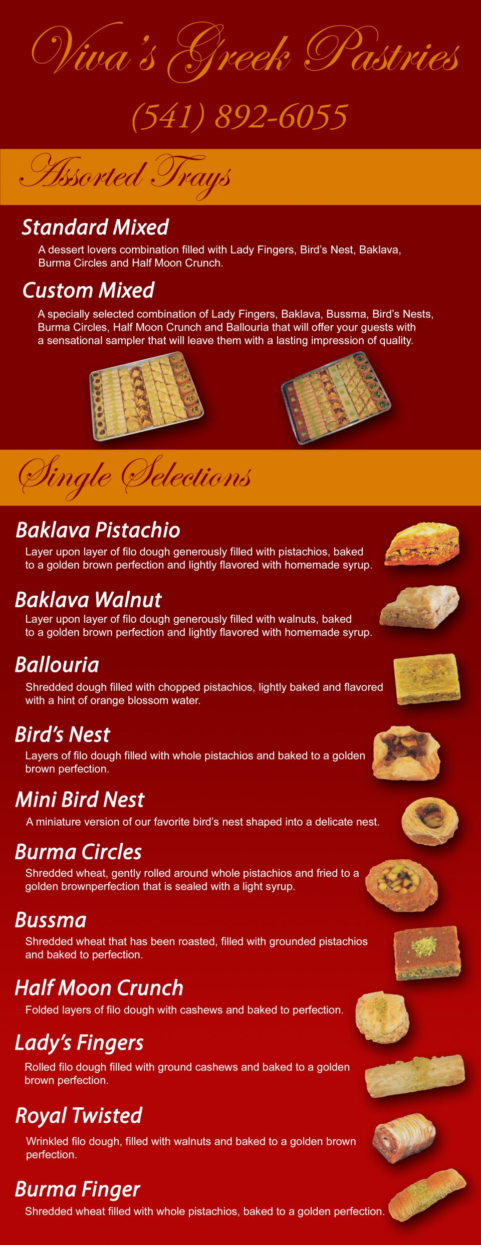 Viva's Greek Pastries are deliciously rich, sweet pastries made of layers of phyllo dough filled with chopped nuts, such as walnuts, almonds, or pistachios, and sweetened with syrup or honey. The result is a treat so delicious that it will make your mouth water with every crispy delicious bite. Baklava is an example of human ingenuity in developing food that not only nourishes the body but also brings happiness to the mind and spirit. Vivas Greek Pastries is happy to supply traditionally handcrafted delicious baklava and more.